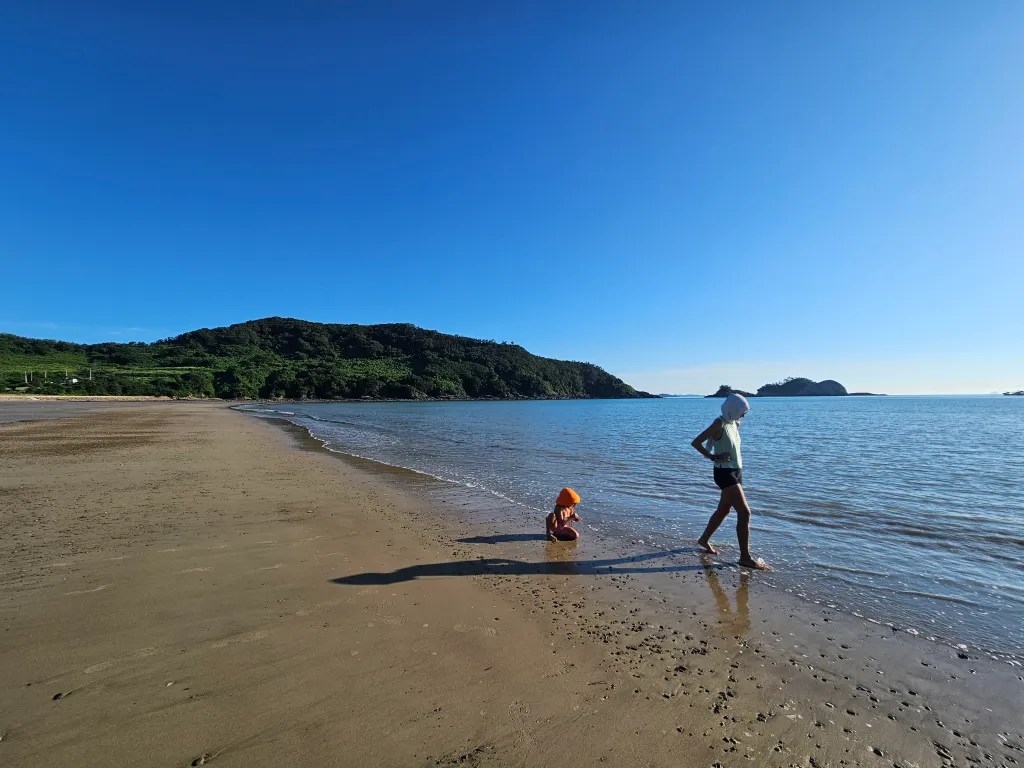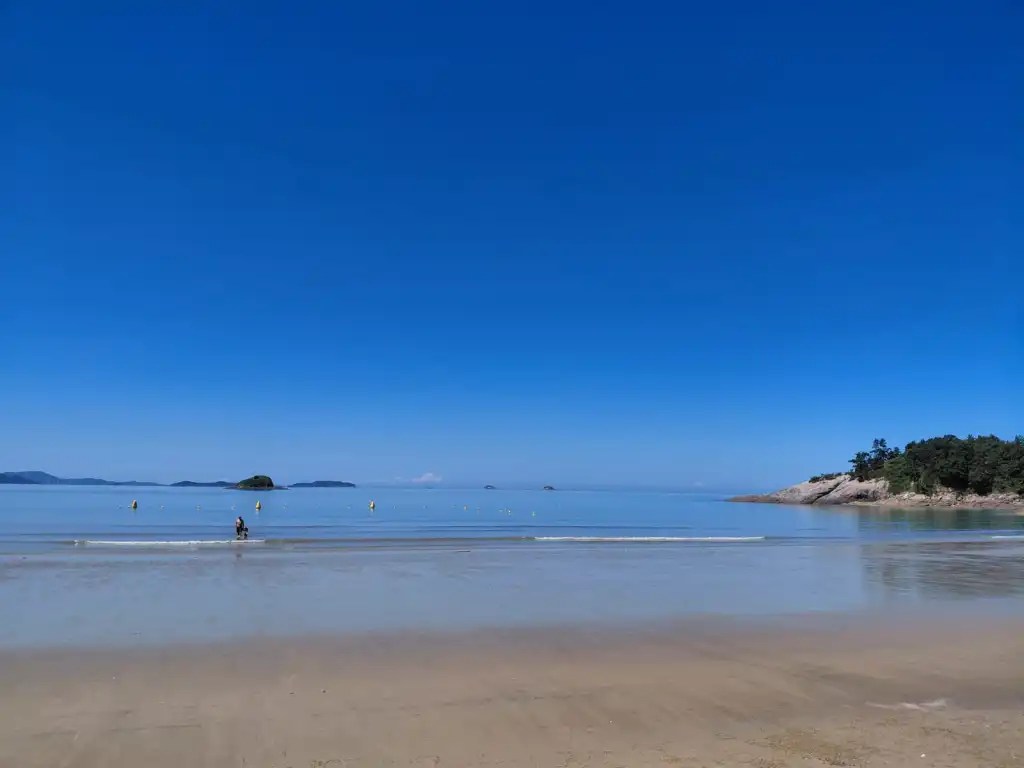 Après une longue attente, nous avons nos tickets et nous nous dépêchons de monter dans le ferry qui part quasiment aussitôt. Comme d’habitude dans les ferrys coréens, il n’y a pas de places assises mais des espaces aménagés au sol où l’on doit enlever ses chaussures. Nous imitons les locaux, qui s’allongent allégrement sur le sol. Clémence fait des constructions avec les petits oreillers en forme de brique (et presque aussi durs!) fournis et nous sommes vite arrivés. Nous récupérons nos vélos et nous roulons quelques kilomètres jusqu’à la plage d’un grand resort, posé au milieu de nulle part. Sur la route, un coréen en voiture s’arrête à notre hauteur et nous donne des boissons fraiches par sa fenêtre. Ce n’est pas la première fois que cela nous arrive et la générosité des gens de ce pays ne cessera jamais de nous surprendre. Il n’y a pas foule sur la plage du resort malgré la période des vacances scolaires dans le pays, nous profitons donc d’une plage paradisiaque presque uniquement pour nous.