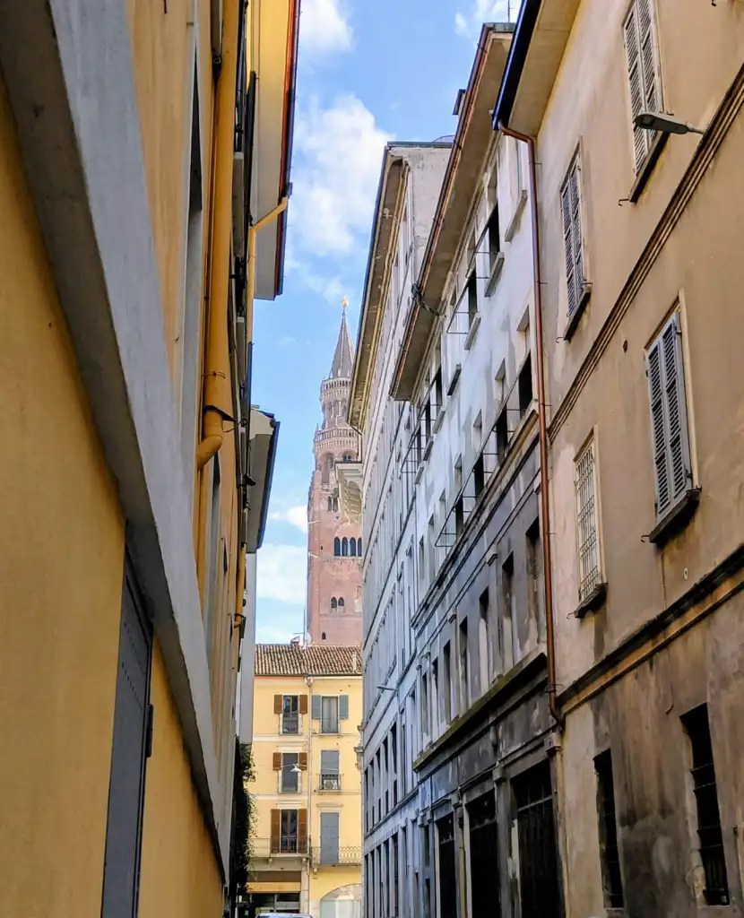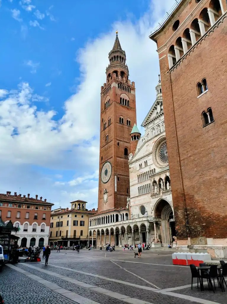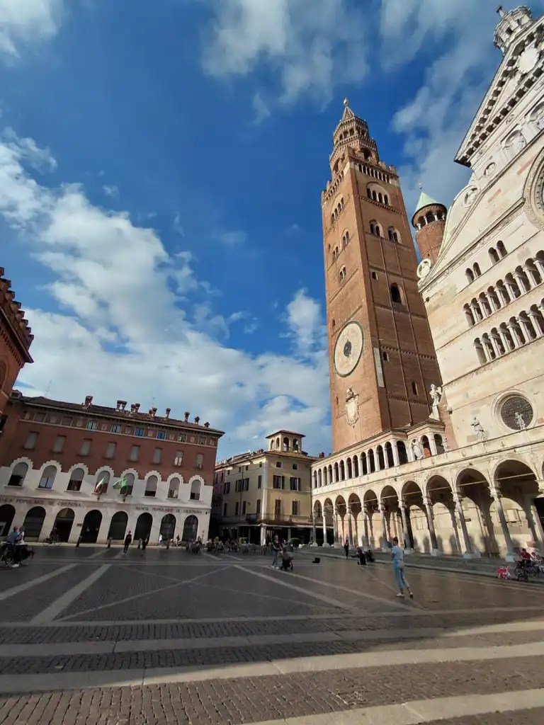 Crémone est aussi une ville éternelle, datant de bien avant la naissance de Jésus Christ et ses rues respirent l’histoire. Elle est aussi le lieu de naissance et de décès du fameux luthier, Antonio Stradivari. En flânant, on trouve d’innombrables magasins de violons « bottega di liuteria », des statues représentant l’instrument de musique et des hommages à Stradivarius. Sur la place centrale Piazza del Comune, un jeune homme joue joliment des airs populaires. Nous l’écoutons en contemplant le Duomo di Santa Maria Assunta et son baptistère. Il fait doux, les familles jouent avec leurs enfants sur la grande Piazza del Comune et il règne un calme rafraichissant pour un centre-ville.