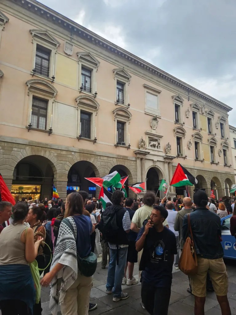 Sur l’une d’entre elles, on comprend pourquoi les italiens étaient en grève aujourd’hui. Ils manifestent contre le refus du gouvernement d’extrême-droite de reconnaître l’état de Palestine en même temps que les autres pays européens. L’université de Padoue a donc organisé un grand rassemblement. Voyager permet de découvrir les différences fondamentales entre les pays et le maintien de l’ordre en fait aussi partie. Ici, les policiers italiens sont certes armés mais ils sont vêtus de manière normale, on croirait voir la police française des années 90. Cela n’a rien à voir avec les armures de footballeurs américains qu’arborent les CRS en manifestation.